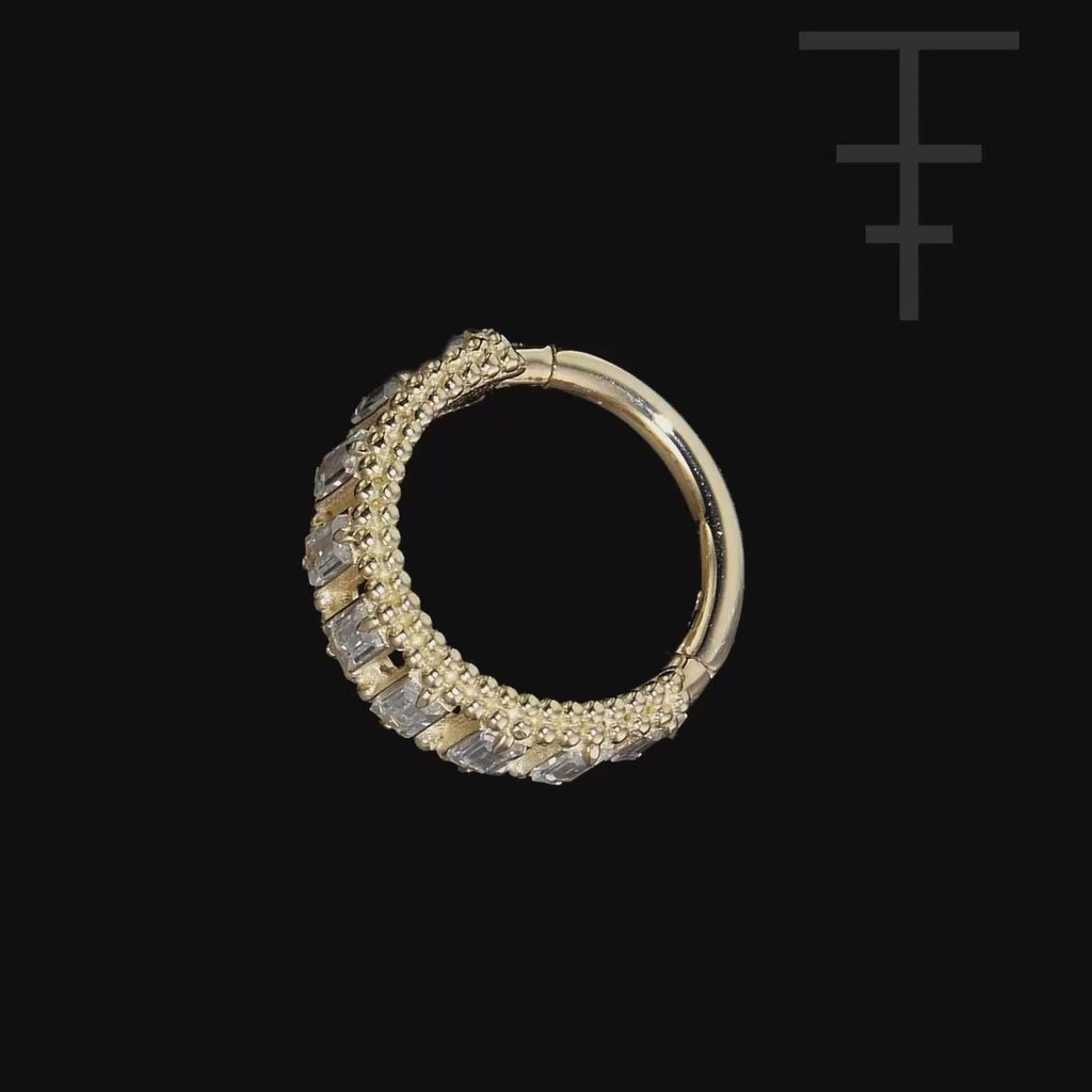 Gemstones: (9) 3x1.5mm Baguette gemstones Inner Diameter: 5/16" or 3/8" with 16g (1.2mm) Available in 16g (1.2mm) only Gemstone and Solid 14k Gold options available as listed. Custom orders available by request. Made locally in Downtown Los Angeles, California.